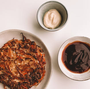 Garnish the okonomiyaki with your toppings of choice. We like a drizzle of vegan mayonnaise and BBQ sauce, plus green onions, sesame seeds, and vegan Furikake.