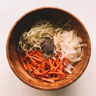Mix the kombu, garlic, ginger, maple syrup, shoyu spring onion, carrots and gochugaro in a bowl – this will be the paste in which you will ferment the kimchi. It should already smell very aromatic and appetizing at this moment.