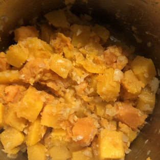 Start off by cutting your pumpkin into small cubes and add it to boiling water. Let the pumpkin cook until it's soft. (It took 15 minutes for mine)